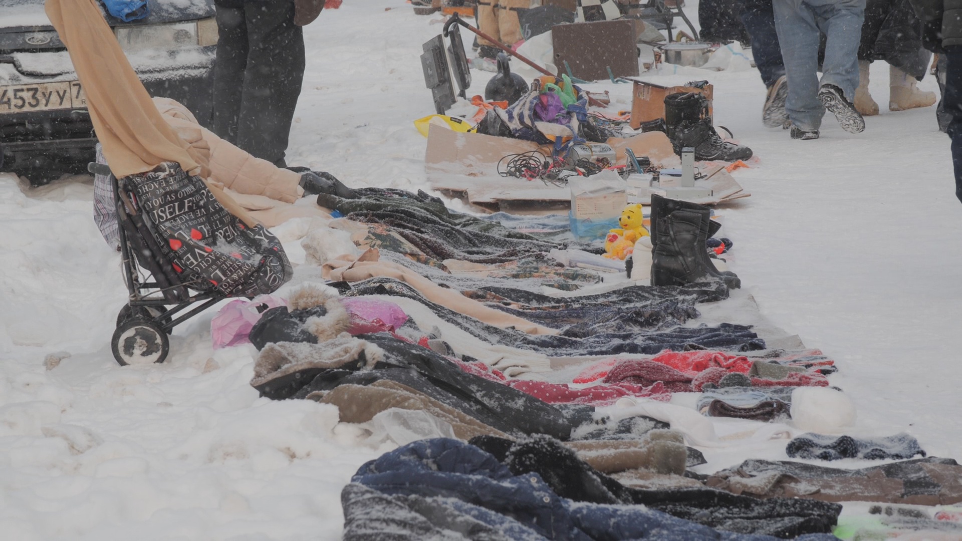 Егор Полтарыхин, корреспондент: «Зимой рынок однозначно тоже живёт. Но зимой его правили немного меняются. Становится меньше продавцов и покупателей — не все готовы стоять на морозе и выставлять свой товар на снегу. Сейчас здесь покупают те же люди, что и продают. Один мужчина даже рассказал, что он здесь же тратит всё, что зарабатывает за день».