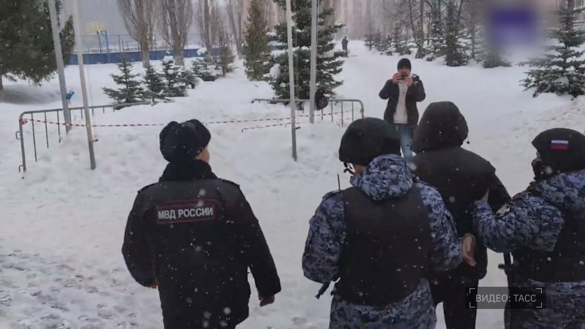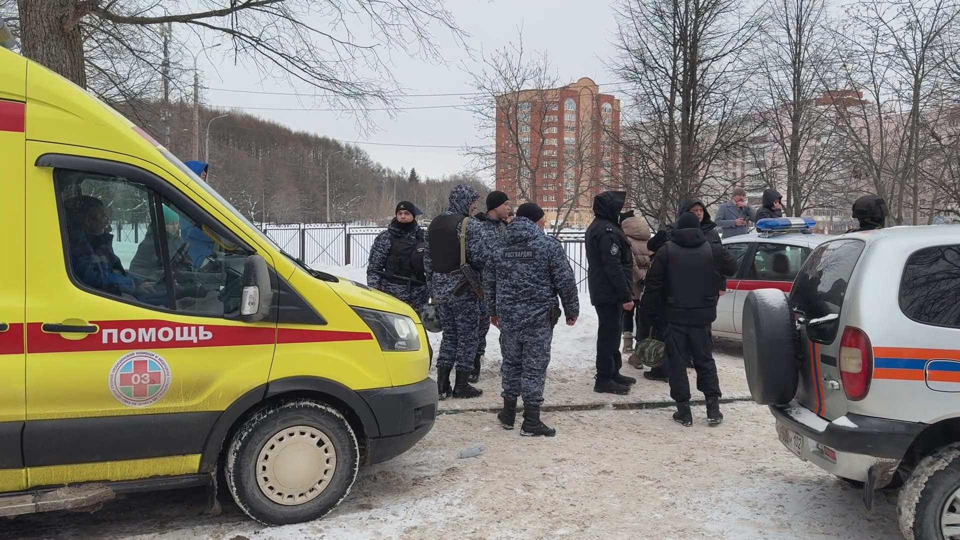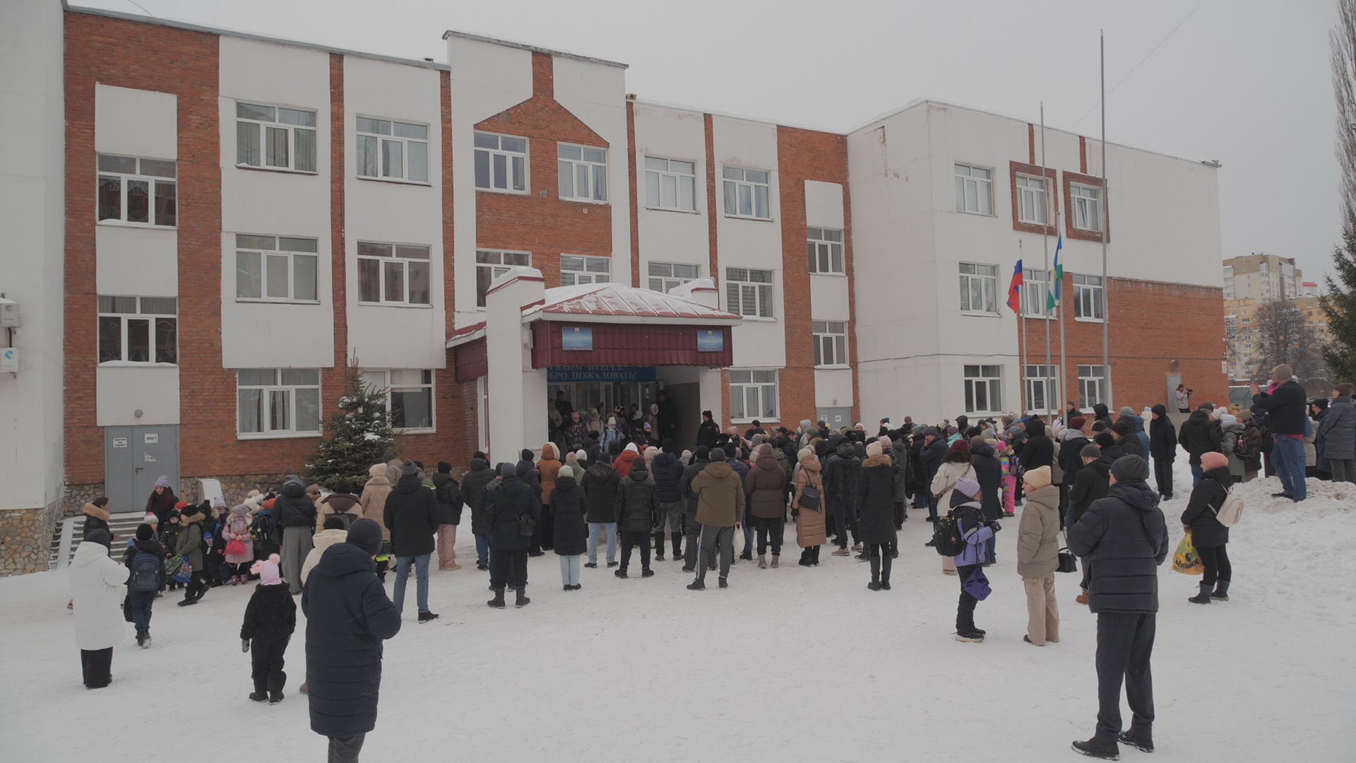 У школы собрались встревоженные родители, пытающиеся узнать о судьбе детей. В суматохе, одна из учениц, не дожидаясь профессиональных спасателей, спрыгнула из окна первого этажа, где ее уже встретили взрослые.