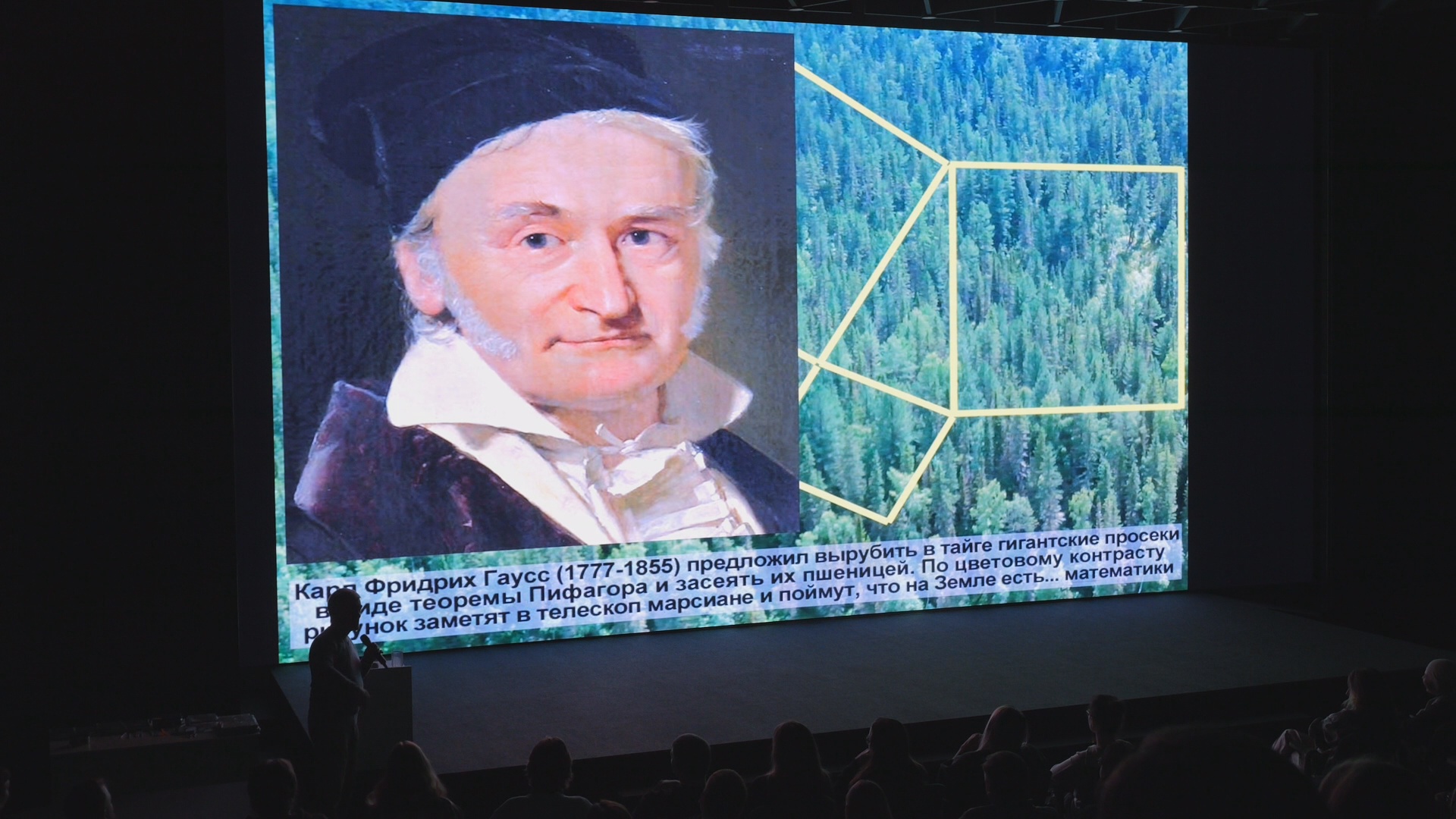 Владимир Сурдин, ученый, просветитель: «Значит, как им сообщить о нас, что мы тут, на Земле, тоже кое-что умеем? А Фридрих Гаусс, немецкий математик знаменитый, он предложил такой способ, говорит: "Слушайте, у русских там тайга, пропадает. Давайте в тайге выбреем, ну, просеки такие сделаем — в виде теоремы Пифагора — и засеем их пшеницей. И тогда жёлтый рисунок на зелёном фоне — марсиане увидят". Ну, теорема Пифагора — значит, на Земле пятиклассники, по крайней мере, живут».