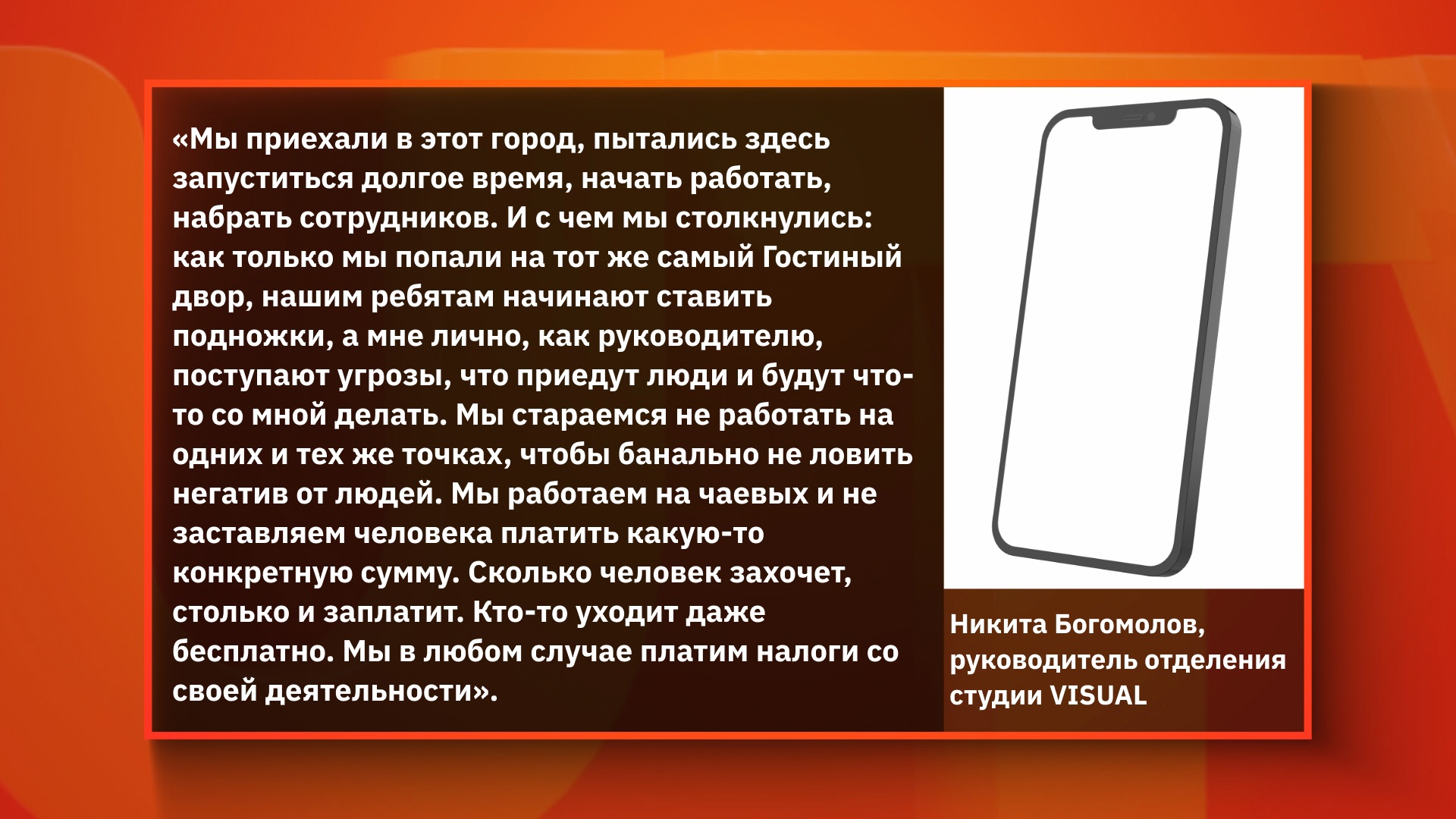 По словам человека, назвавшего себя представителем студии VISUAL, компания из Красноярска якобы принадлежит коммерсанту из Красноярска – Александру Котельникову. Основной вид деятельности бизнесмена – химчистка, а уличные фотографы лишь один из видов извлечения прибыли. Несовершеннолетних сотрудников они, со слов нашего собеседника, нанимают с согласия родителей.