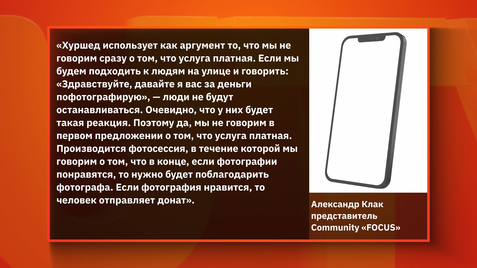 Хуршед Нурматов, блогер: «В комментариях к моим роликам, люди отписались, что сами фотографии получаются ужасные. То есть по факту, даже если считать, что услуга какая-то оказывается то, она оказывается некачественной, эти деньги просто не должны платиться этим людям. И многие уфимцы у меня в комментариях писали, что пожалели, что отдали эти деньги, что считают себя обманутыми. Многие люди просто не умеют отказывать».
