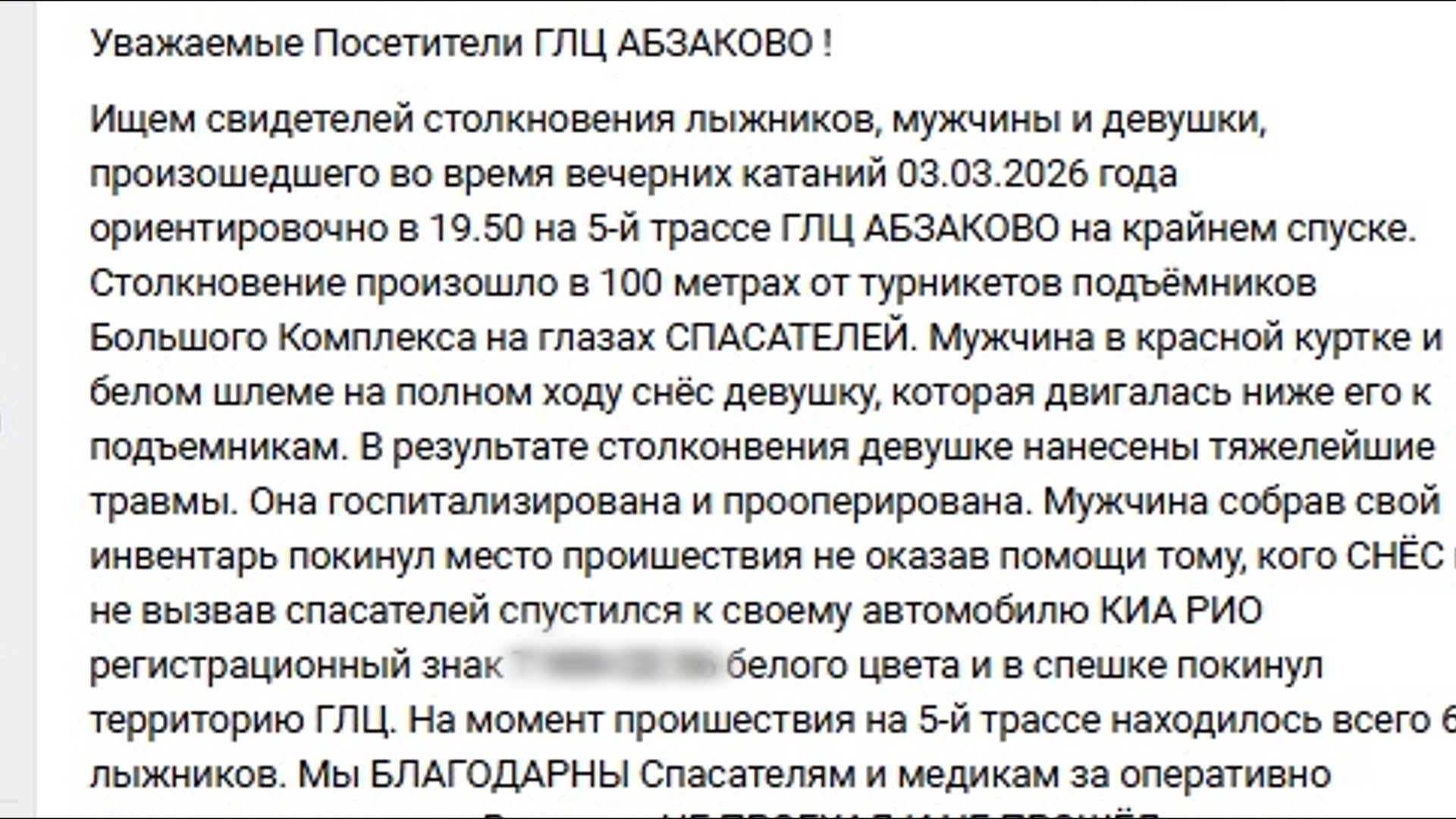 Вечером 3 марта в горнолыжном центре «Абзаково» в Белорецком районе республики на глазах у спасателей неизвестный мужчина на полном ходу снес девушку. Такое сообщение появилось в официальных сетях курорта. Как уточняется в публикации, от удара она получила «тяжелейшие травмы». Пострадавшей потребовалась операция. Согласно сообщению, мужчина, собрав свой инвентарь, покинул место происшествия, не оказав помощи девушке. Он не вызвал спасателей, спустился к своему автомобилю и в спешке покинул территорию горнолыжного центра. Сотрудники курорта обратились в полицию. Также говорится, что лыжником оказался 32-летний житель Оренбурга.